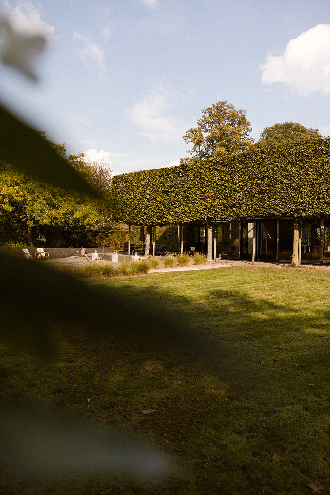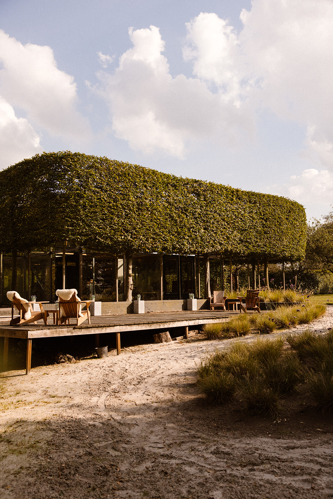 Het Paviljoen — Een lichte glazen ruimte met zicht op boomgaard, bloemen en strandkuil. Intiem voor sessies tot 20 personen. In geselecteerde gevallen geschikt voor grotere opstellingen en diners.